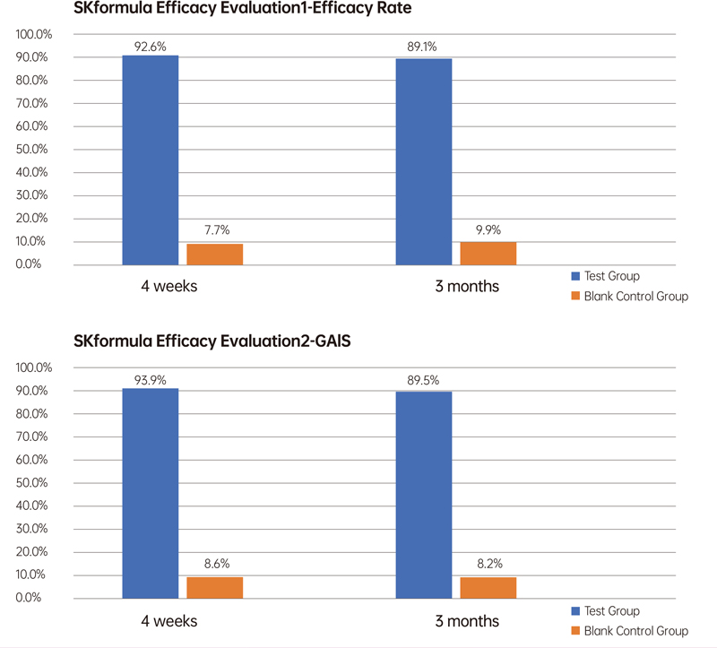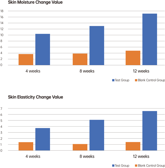 Based on the comparison of the two sets of data, it can be concluded that the skin moisture and elasticity levels of the test group showed a steady increasing trend at weeks 4, 8, and 12 after continuous use of the SKformula product. Moreover, the degree of improvement at each time point was significantly better than that of the blank control group, indicating that the product delivers clear and sustained effects in long-term moisturizing and enhancing skin elasticity.